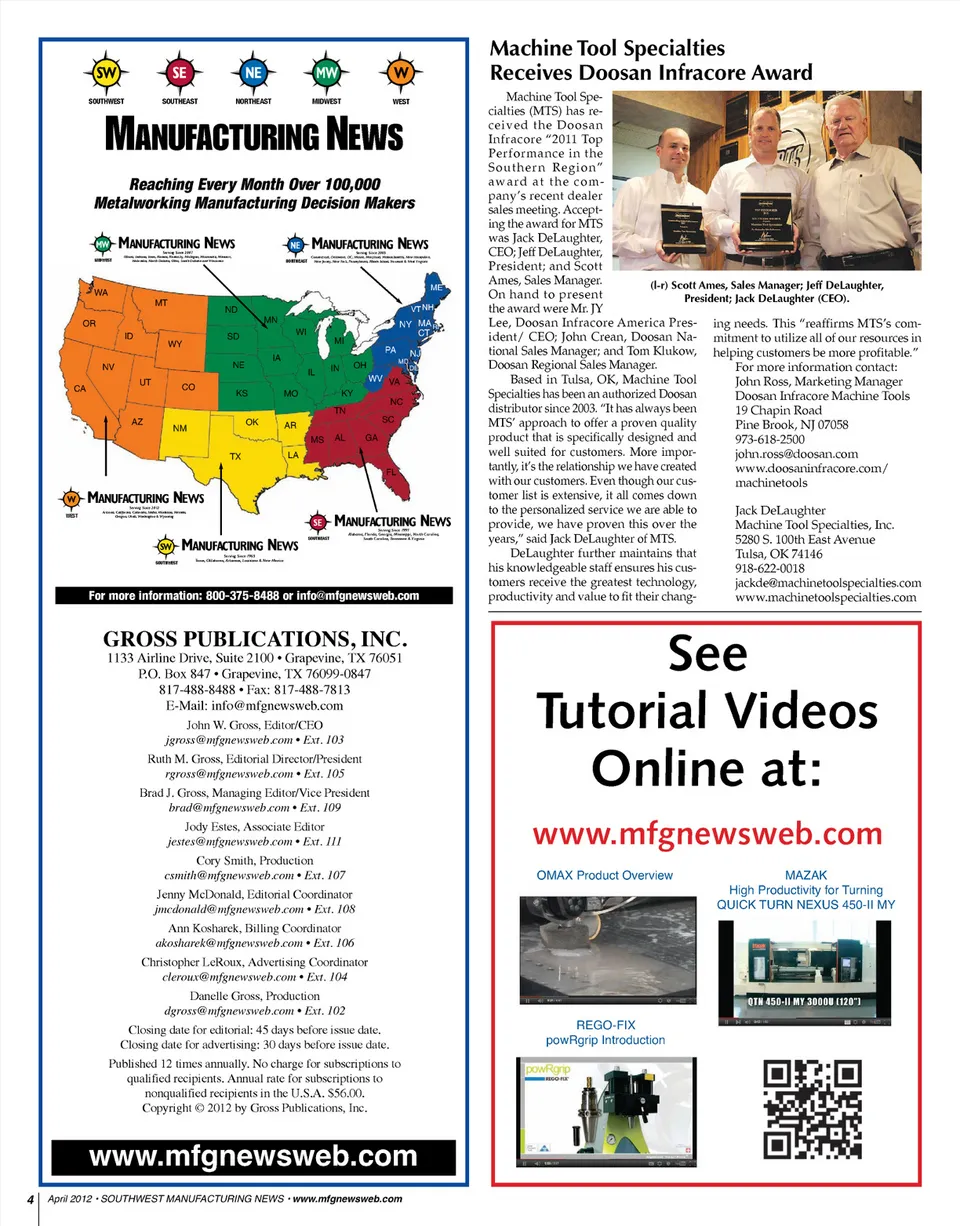 SW SOUTHWEST SE SOUTHEAST NE NORTHEAST MW MIDWEST W WEST Machine Tool Specialties Receives Doosan Infracore Award Machine Tool Spe-cialties (MTS) has re-ceived the Doosan Infracore “2011 Top Performance in the S ou thern R eg ion” aw ard at the com -pany’s recent dealer sales meeting. Accept-ing the award for MTS was Jack DeLaughter, CEO; Jeff DeLaughter, President; and Scott Ames, Sales Manager. (l-r) Scott Ames, Sales Manager; Jeff DeLaughter, On hand to present President; Jack DeLaughter (CEO). the award were Mr. JY Lee, Doosan Infracore America Pres-ing needs. This “reaffirms MTS’s com-ident/ CEO; John Crean, Doosan Na-mitment to utilize all of our resources in tional Sales Manager; and Tom Klukow, helping customers be more profitable.” Doosan Regional Sales Manager. For more information contact: Based in Tulsa, OK, Machine Tool John Ross, Marketing Manager Specialties has been an authorized Doosan Doosan Infracore Machine Tools distributor since 2003. “It has always been 19 Chapin Road MTS’ approach to offer a proven quality Pine Brook, NJ 07058 product that is specifically designed and 973-618-2500 well suited for customers. More impor-john.ross@doosan.com tantly, it’s the relationship we have created www.doosaninfracore.com/ with our customers. Even though our cus-machinetools tomer list is extensive, it all comes down to the personalized service we are able to Jack DeLaughter provide, we have proven this over the Machine Tool Specialties, Inc. years,” said Jack DeLaughter of MTS. 5280 S. 100th East Avenue DeLaughter further maintains that Tulsa, OK 74146 his knowledgeable staff ensures his cus-918-622-0018 tomers receive the greatest technology, jackde@machinetoolspecialties.com productivity and value to fit their chang-www.machinetoolspecialties.com M ANUFACTURING N EWS Reaching Every Month Over 100,000 Metalworking Manufacturing Decision Makers MW MIDWEST M ANUFACTURING N EWS Serving Since 2007 Illinois, Indiana, Iowa, Kansas, Kentucky, Michigan, Minnesota, Missouri, Nebraska, North Dakota, Ohio, South Dakota and Wisconsin NE NORTHEAST M ANUFACTURING N EWS Serving Since 2005 Connecticut, Delaware, DC, Maine, Maryland, Massachusetts, New Hampshire, New Jersey, New York, Pennsylvania, Rhode Island, Vermont & West Virginia WA OR NV ID UT AZ MT WY CO NM ND SD NE KS OK TX MN IA WI IL MI IN CA OH PA NY MA RI CT MD DE VT NH ME MO AR LA TN MS AL KY WV VA SC NJ NC GA FL W WEST M ANUFACTURING N EWS Serving Since 2012 Arizona, California, Colorado, Idaho, Montana, Nevada, Oregon, Utah, Washington & Wyoming SE SW SOUTHWEST M ANUFACTURING N EWS Serving Since 1997 Alabama, Florida, Georgia, Mississippi, North Carolina, South Carolina, Tennessee & Virginia M ANUFACTURING N EWS Serving Since 1965 Texas, Oklahoma, Arkansas, Louisiana & New Mexico SOUTHEAST For more information: 800-375-8488 or info@mfgnewsweb.com GROSS PUBLICATIONS, INC. 1133 Airline Drive, Suite 2100 • Grapevine, TX 76051 P.O. Box 847 • Grapevine, TX 76099-0847 817-488-8488 • Fax: 817-488-7813 E-Mail: info@mfgnewsweb.com John W. Gross, Editor/CEO jgross@mfgnewsweb.com • Ext. 103 Brad J. Gross, Managing Editor/Vice President brad@mfgnewsweb.com • Ext. 109 Cory Smith, Production csmith@mfgnewsweb.com • Ext. 107 Jody Estes, Associate Editor jestes@mfgnewsweb.com • Ext. 111 Ruth M. Gross, Editorial Director/President rgross@mfgnewsweb.com • Ext. 105 See Tutorial Videos Online at: www.mfgnewsweb.com OMAX Product Overview MAZAK High Productivity for Turning QUICK TURN NEXUS 450-II MY Jenny McDonald, Editorial Coordinator jmcdonald@mfgnewsweb.com • Ext. 108 Christopher LeRoux, Advertising Coordinator cleroux@mfgnewsweb.com • Ext. 104 Danelle Gross, Production dgross@mfgnewsweb.com • Ext. 102 Ann Kosharek, Billing Coordinator akosharek@mfgnewsweb.com • Ext. 106 Closing date for editorial: 45 days before issue date. Closing date for advertising: 30 days before issue date. Published 12 times annually. No charge for subscriptions to qualified recipients. Annual rate for subscriptions to nonqualified recipients in the U.S.A. $56.00. Copyright © 2012 by Gross Publications, Inc. REGO-FIX powRgrip Introduction 4 April 2012 • SOUTHWEST MANUFACTURING NEWS • www.mfgnewsweb.com www.mfgnewsweb.com