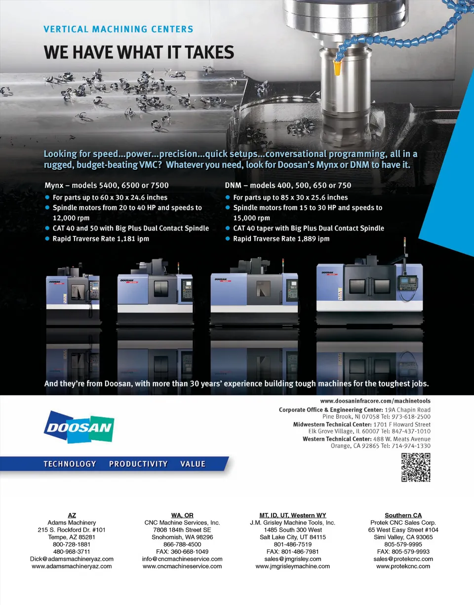 AZ Adams Machinery 215 S. Rockford Dr. #101 Tempe, AZ 85281 800-728-1881 480-968-3711 Dick@adamsmachineryaz.com www.adamsmachineryaz.com WA, OR CNC Machine Services, Inc. 7808 184th Street SE Snohomish, WA 98296 866-788-4500 FAX: 360-668-1049 info@cncmachineservice.com www.cncmachineservice.com MT, ID, UT, Western WY J.M. Grisley Machine Tools, Inc. 1485 South 300 West Salt Lake City, UT84115 801-486-7519 FAX: 801-486-7981 sales@jmgrisley.com www.jmgrisleymachine.com Southern CA Protek CNC Sales Corp. 65 West Easy Street #104 Simi Valley, CA 93065 805-579-9995 FAX: 805-579-9993 sales@protekcnc.com www.protekcnc.com
