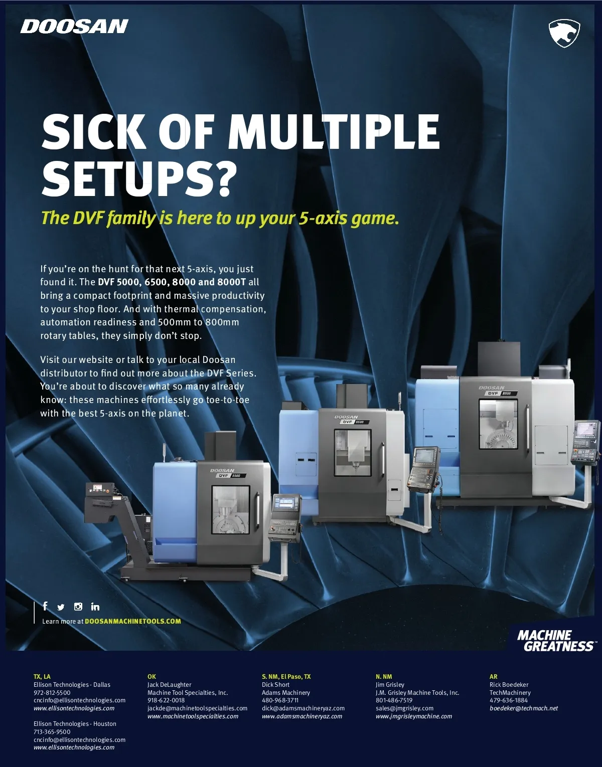 SICK O F M U L T I P LE S E T U P S? T h e D VF F f a m il l y is h e re e to o up y o u r 5 -ax x i is g a m e . If y ou’r e on the hu nt f or th at ne xt 5-ax i s, y ou ju s t f ou nd it . Th The he D VF 5 000, 000 65 00, 00 800 00 and 8000T al l brin g a c om mp act f ootprint and m a s s iv e pr oductiv ity W R  \ R X U V K R S  Ȫ R R U   $ Q G  Z L W K W K H U P D O  F R P S H Q V D W L R Q �f;  aut om ation n r e a dine s s and 500mm m t o 800mm r ot ar y t ab l e s, they s imp ly don’t s t op . 9 L V L W  R X U Z H E V L W H  R U  W D O N  W R  \ R X U  O R F D O  ' R R V D Q  G L V W U L E X W R U  W R ȩ Q G  R X W  P R U H  D E R X W  W K H  ' 9 )  6 H U L H V   < R X Ǩ U H  D E R X W W R  G L V F R Y H U  Z K D W  V R  P D Q \ D O U H D G \  N Q R Z d;  W K H V H P D F K L Q H V  H Ȩ R U W O H V V O \  J R  W R H W R W R H  Z L W K  W K H E H V W   D [ L V  R Q  W K H S O D Q H W  L e a r n m o r e a t D O O S A N M A C HIN E T O OL S . C O M TX, LA El li son T ec hno logie s -Dal l a s 9 7 2-812-5500 c nc inf o@el li sont ec hno logie s.c om www .e l lison t e c hno logi e s.c om El li son T ec hno logie s -Hou s t on 71 3-365-9500 c nc inf o@el li sont ec hno logie s.c om www .e l lison t e c hno logi e s.c om OK Jac k D eLaught er M ac hine T oo l S pec i altie s, Inc . 918-6 22-0018 j ac k de@m ac hinet oo l s pec i altie s.c om www .mac hin etoo l spe cia lti e s.c om S. NM, El P a so , TX Dick k Shor t Ad ams M ac hiner y 480-968-3711 dic k @a d amsm ac hiner y az.c om www w. .adamsmac hin eryaz.c om N. NM Jim Gri s l ey J.M. Gri s l ey M ac hine T oo l s, Inc . 801-486-7 5 1 9 s al e s @jm gri s l ey .c om www .jmgris le ymac hin e.c om AR Rick k Boedek er T ec hM ac hiner y 47 9-6 36-1884 boe dek er@t e c hmac h.n et