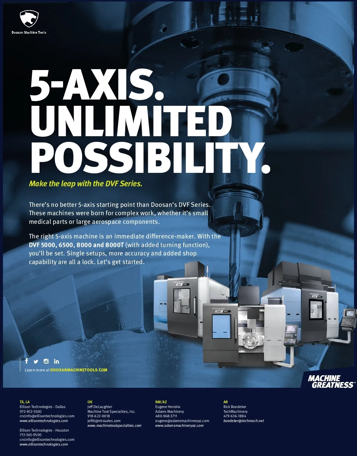 A X IS. U N L IM I I T E D P O S SIB S B ILI TY T Y . M a ke e t h e l e ap with i t h t h e DVF D F S e rie i e s . Ther e’s no bett er 5-ax i s s t ar t in g point th an Doo s an’s a D VF Serie s. The se m ac hine s w er e born f or o c omp l e x w ork, whe ether it’s sm al l medic al p ar ts or l ar g e aer o s p ac e c omponents. p The right 5-ax i s m ac hine i s an n immedi at e differ en c e-m ak er . W ith the D VF 5 000, 65 00, 8000 and 80 000T (w ith a d ded t ur rnin g f u nction), y ou’l l be set . Sin gl e set up s, mor m e ac c ur acy and a d ded shop c ap ab i lity ar e al l a loc k. L et’s s g et s t a r t ed. L e a r n m o r e a t DOO S A N M A CH IN E T OO L S . C O M TX, LA El li son T ec hno logie s -Dal l a s 9 7 2-812-5500 c nc inf o@el li sont ec hno logie s.c om www .e l lison t e c hno logi e s.c om El li son T ec hno logie s -Hou s t on 71 3-365-9500 c nc inf o@el li sont ec hno logie s.c om www .e l lison t e c hno logi e s.c om OK Jeff D eLaught er M ac hine T oo l S pec i altie s, Inc . 918-6 22-0018 j effd@mts s al e s.c om www w. .mac hin etoo l ls spe cia lti e s.c om NM/AZ E ug ene Hendri x Ad ams M ac hiner y 480-968-3711 eug ene@a d amsm ac hiner y az.c om www .adamsmac hin eryaz.c om AR Ric k Boedek er T ec hM ac hiner y 47 9-6 36-1884 boe dek er@t e c hmac h.n et