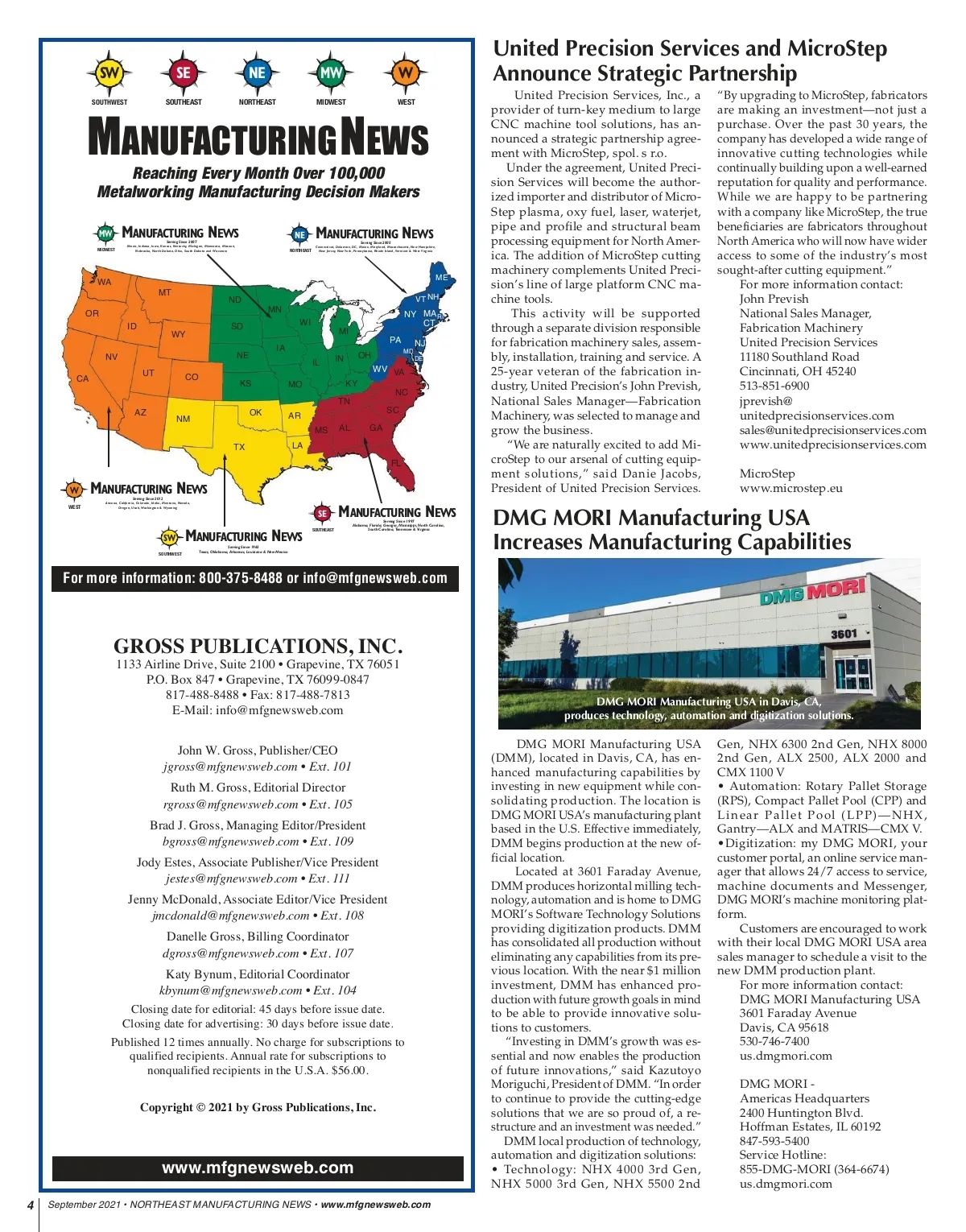 SW SOUTHWEST SE SOUTHEAST NE NORTHEAST MW MIDWEST W WEST United Precision Services and MicroStep Announce Strategic Partnership United Precision Services, Inc., a provider of turn-key medium to large CNC machine tool solutions, has an-nounced a strategic partnership agree-ment with MicroStep, spol. s r.o. Under the agreement, United Preci-sion Services will become the author-ized importer and distributor of Micro-Step plasma, oxy fuel, laser, waterjet, pipe and profile and structural beam processing equipment for North Amer-ica. The addition of MicroStep cutting machinery complements United Preci-sion’s line of large platform CNC ma-chine tools. This activity will be supported through a separate division responsible for fabrication machinery sales, assem-bly, installation, training and service. A 25-year veteran of the fabrication in-dustry, United Precision’s John Prevish, National Sales Manager—Fabrication Machinery, was selected to manage and grow the business. “We are naturally excited to add Mi-croStep to our arsenal of cutting equip-ment solutions,” said Danie Jacobs, President of United Precision Services. “By upgrading to MicroStep, fabricators are making an investment—not just a purchase. Over the past 30 years, the company has developed a wide range of innovative cutting technologies while continually building upon a well-earned reputation for quality and performance. While we are happy to be partnering with a company like MicroStep, the true beneficiaries are fabricators throughout North America who will now have wider access to some of the industry’s most sought-after cutting equipment.” For more information contact: John Prevish National Sales Manager, Fabrication Machinery United Precision Services 11180 Southland Road Cincinnati, OH 45240 513-851-6900 jprevish@ unitedprecisionservices.com sales@unitedprecisionservices.com www.unitedprecisionservices.com MicroStep www.microstep.eu M ANUFACTURING N EWS Reaching Every Month Over 100,000 Metalworking Manufacturing Decision Makers MW MI D W ES T M ANUFACTURING N EWS Serving Since 2007 Illinois, Indiana, Iowa, Kansas, Kentucky, Michigan, Minnesota, Missouri, Nebraska, North Dakota, Ohio, South Dakota and Wisconsin NE N O RTH E A S T M ANUFACTURING N EWS Serving Since 2005 Connecticut, Delaware, DC, Maine, Maryland, Massachusetts, New Hampshire, New Jersey, New York, Pennsylvania, Rhode Island, Vermont & West Virginia WA MT OR ID WY SD NE UT CO KS OK IA IL MO IN KY NC TN AZ NM TX AR MS LA FL AL GA SC ND MN WI MI PA OH MD DE ME VT NH NY MA RI CT NJ NV CA WV VA W W ES T M ANUFACTURING N EWS Serving Since 2012 Arizona, California, Colorado, Idaho, Montana, Nevada, Oregon, Utah, Washington & Wyoming SE SW SO UTHW ES T M ANUFACTURING N EWS Serving Since 1997 Alabama, Florida, Georgia, Mississippi, North Carolina, South Carolina, Tennessee & Virginia M ANUFACTURING N EWS Serving Since 1965 Texas, Oklahoma, Arkansas, Louisiana & New Mexico SO UTH E A S T DMG MORI Manufacturing USA Increases Manufacturing Capabilities For more information: 800-375-8488 or info@mfgnewsweb.com GROSS PUBLICATIONS, INC. 1133 Airline Drive, Suite 2100 • Grapevine, TX 76051 P.O. Box 847 • Grapevine, TX 76099-0847 817-488-8488 • Fax: 817-488-7813 E-Mail: info@mfgnewsweb.com John W. Gross, Publisher/CEO jgross@mfgnewsweb.com • Ext. 101 Ruth M. Gross, Editorial Director rgross@mfgnewsweb.com • Ext. 105 Brad J. Gross, Managing Editor/President bgross@mfgnewsweb.com • Ext. 109 Jody Estes, Associate Publisher/Vice President jestes@mfgnewsweb.com • Ext. 111 Jenny McDonald, Associate Editor/Vice President jmcdonald@mfgnewsweb.com • Ext. 108 Danelle Gross, Billing Coordinator dgross@mfgnewsweb.com • Ext. 107 Katy Bynum, Editorial Coordinator kbynum@mfgnewsweb.com • Ext. 104 Closing date for editorial: 45 days before issue date. Closing date for advertising: 30 days before issue date. Published 12 times annually. No charge for subscriptions to qualified recipients. Annual rate for subscriptions to nonqualified recipients in the U.S.A. $56.00. Copyright © 2021 by Gross Publications, Inc. DMG MORI Manufacturing USA in Davis, CA, produces technology, automation and digitization solutions. www.mfgnewsweb.com 4 September 2021 • NORTHEAST MANUFACTURING NEWS • www.mfgnewsweb.com DMG MORI Manufacturing USA (DMM), located in Davis, CA, has en-hanced manufacturing capabilities by investing in new equipment while con-solidating production. The location is DMG MORI USA’s manufacturing plant based in the U.S. Effective immediately, DMM begins production at the new of-ficial location. Located at 3601 Faraday Avenue, DMM produces horizontal milling tech-nology, automation and is home to DMG MORI’s Software Technology Solutions providing digitization products. DMM has consolidated all production without eliminating any capabilities from its pre-vious location. With the near $1 million investment, DMM has enhanced pro-duction with future growth goals in mind to be able to provide innovative solu-tions to customers. “Investing in DMM’s growth was es-sential and now enables the production of future innovations,” said Kazutoyo Moriguchi, President of DMM. “In order to continue to provide the cutting-edge solutions that we are so proud of, a re-structure and an investment was needed.” DMM local production of technology, automation and digitization solutions: • Technology: NHX 4000 3rd Gen, NHX 5000 3rd Gen, NHX 5500 2nd Gen, NHX 6300 2nd Gen, NHX 8000 2nd Gen, ALX 2500, ALX 2000 and CMX 1100 V • Automation: Rotary Pallet Storage (RPS), Compact Pallet Pool (CPP) and Linear Pallet Pool (LPP)—NHX, Gantry—ALX and MATRIS—CMX V. •Digitization: my DMG MORI, your customer portal, an online service man-ager that allows 24/7 access to service, machine documents and Messenger, DMG MORI’s machine monitoring plat-form. Customers are encouraged to work with their local DMG MORI USA area sales manager to schedule a visit to the new DMM