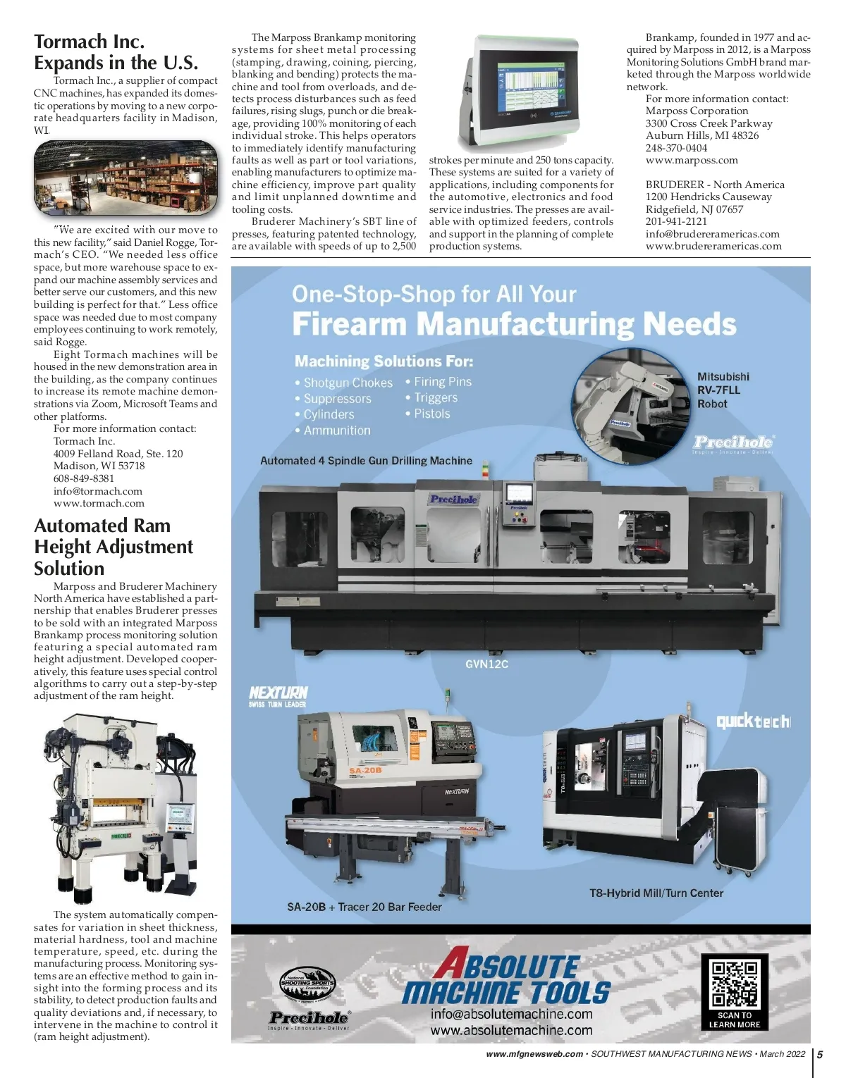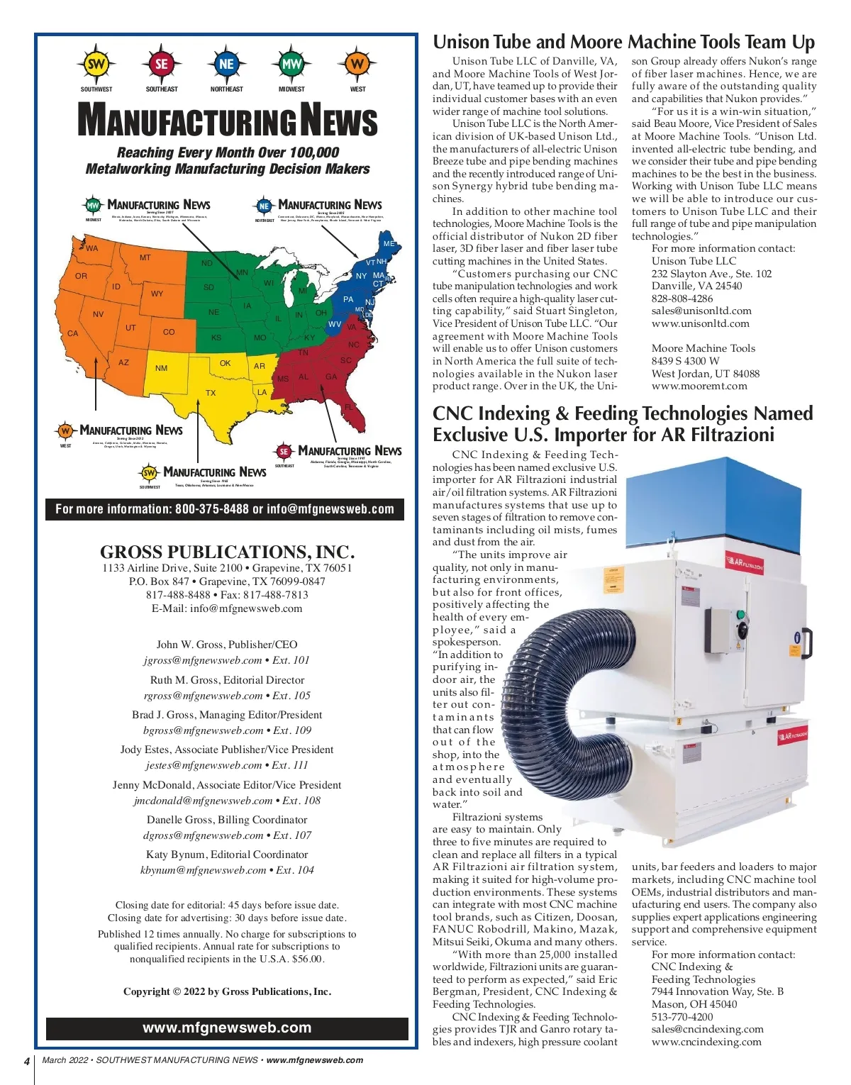 Unison Tube and Moore Machine Tools Team Up SW SOUTHWEST SE SOUTHEAST NE NORTHEAST MW MIDWEST W WEST M ANUFACTURING N EWS Reaching Every Month Over 100,000 Metalworking Manufacturing Decision Makers MW MI D W ES T M ANUFACTURING N EWS Serving Since 2007 Illinois, Indiana, Iowa, Kansas, Kentucky, Michigan, Minnesota, Missouri, Nebraska, North Dakota, Ohio, South Dakota and Wisconsin NE N O RTH E A S T M ANUFACTURING N EWS Serving Since 2005 Connecticut, Delaware, DC, Maine, Maryland, Massachusetts, New Hampshire, New Jersey, New York, Pennsylvania, Rhode Island, Vermont & West Virginia WA MT OR ID WY SD NE UT CO KS OK IA IL MO IN KY NC TN AZ NM TX AR MS LA FL AL GA SC ND MN WI MI PA OH MD DE ME VT NH NY MA RI CT NJ NV CA WV VA Unison Tube LLC of Danville, VA, and Moore Machine Tools of West Jor-dan, UT, have teamed up to provide their individual customer bases with an even wider range of machine tool solutions. Unison Tube LLC is the North Amer-ican division of UK-based Unison Ltd., the manufacturers of all-electric Unison Breeze tube and pipe bending machines and the recently introduced range of Uni-son Synergy hybrid tube bending ma-chines. In addition to other machine tool technologies, Moore Machine Tools is the official distributor of Nukon 2D fiber laser, 3D fiber laser and fiber laser tube cutting machines in the United States. “Customers purchasing our CNC tube manipulation technologies and work cells often require a high-quality laser cut-ting capability,” said Stuart Singleton, Vice President of Unison Tube LLC. “Our agreement with Moore Machine Tools will enable us to offer Unison customers in North America the full suite of tech-nologies available in the Nukon laser product range. Over in the UK, the Uni-son Group already offers Nukon’s range of fiber laser machines. Hence, we are fully aware of the outstanding quality and capabilities that Nukon provides.” “For us it is a win-win situation,” said Beau Moore, Vice President of Sales at Moore Machine Tools. “Unison Ltd. invented all-electric tube bending, and we consider their tube and pipe bending machines to be the best in the business. Working with Unison Tube LLC means we will be able to introduce our cus-tomers to Unison Tube LLC and their full range of tube and pipe manipulation technologies.” For more information contact: Unison Tube LLC 232 Slayton Ave., Ste. 102 Danville, VA 24540 828-808-4286 sales@unisonltd.com www.unisonltd.com Moore Machine Tools 8439 S 4300 W West Jordan, UT 84088 www.mooremt.com W W ES T M ANUFACTURING N EWS Serving Since 2012 Arizona, California, Colorado, Idaho, Montana, Nevada, Oregon, Utah, Washington & Wyoming SE SW SO UTHW ES T M ANUFACTURING N EWS Serving Since 1997 Alabama, Florida, Georgia, Mississippi, North Carolina, South Carolina, Tennessee & Virginia CNC Indexing & Feeding Technologies Named Exclusive U.S. Importer for AR Filtrazioni CNC Indexing & Feeding Tech-nologies has been named exclusive U.S. importer for AR Filtrazioni industrial air/oil filtration systems. AR Filtrazioni manufactures systems that use up to seven stages of filtration to remove con-taminants including oil mists, fumes and dust from the air. “The units improve air quality, not only in manu-facturing environments, but also for front offices, positively affecting the health of every em-ployee,” said a spokesperson. “In addition to purifying in-door air, the units also fil-ter out con-taminants that can flow out of the shop, into the atmosphere and eventually back into soil and water.” Filtrazioni systems are easy to maintain. Only three to five minutes are required to clean and replace all filters in a typical AR Filtrazioni air filtration system, making it suited for high-volume pro-duction environments. These systems can integrate with most CNC machine tool brands, such as Citizen, Doosan, FANUC Robodrill, Makino, Mazak, Mitsui Seiki, Okuma and many others. “With more than 25,000 installed worldwide, Filtrazioni units are guaran-teed to perform as expected,” said Eric Bergman, President, CNC Indexing & Feeding Technologies. CNC Indexing & Feeding Technolo-gies provides TJR and Ganro rotary ta-bles and indexers, high pressure coolant M ANUFACTURING N EWS Serving Since 1965 Texas, Oklahoma, Arkansas, Louisiana & New Mexico SO UTH E A S T For more information: 800-375-8488 or info@mfgnewsweb.com GROSS PUBLICATIONS, INC. 1133 Airline Drive, Suite 2100 • Grapevine, TX 76051 P.O. Box 847 • Grapevine, TX 76099-0847 817-488-8488 • Fax: 817-488-7813 E-Mail: info@mfgnewsweb.com John W. Gross, Publisher/CEO jgross@mfgnewsweb.com • Ext. 101 Ruth M. Gross, Editorial Director rgross@mfgnewsweb.com • Ext. 105 Brad J. Gross, Managing Editor/President bgross@mfgnewsweb.com • Ext. 109 Jody Estes, Associate Publisher/Vice President jestes@mfgnewsweb.com • Ext. 111 Jenny McDonald, Associate Editor/Vice President jmcdonald@mfgnewsweb.com • Ext. 108 Danelle Gross, Billing Coordinator dgross@mfgnewsweb.com • Ext. 107 Katy Bynum, Editorial Coordinator kbynum@mfgnewsweb.com • Ext. 104 Closing date for editorial: 45 days before issue date. Closing date for advertising: 30 days before issue date. Published 12 times annually. No charge for subscriptions to qualified recipients. Annual rate for subscriptions to nonqualified recipients in the U.S.A. $56.00. Copyright © 2022 by Gross Publications, Inc. www.mfgnewsweb.com 4 March 2022 • SOUTHWEST MANUFACTURING NEWS • www.mfgnewsweb.com units, bar feeders and loaders to major markets, including CNC machine tool OEMs, industrial distributors and man-ufacturing end users. The company also supplies expert applications engineering support and comprehensive equipment service. For more information contact: CNC Indexing & Feeding Technologies 7944 Innovation Way, Ste. B Mason, OH 45040 513-770-4200 sales@cncindexing.com www.cncindexing.com