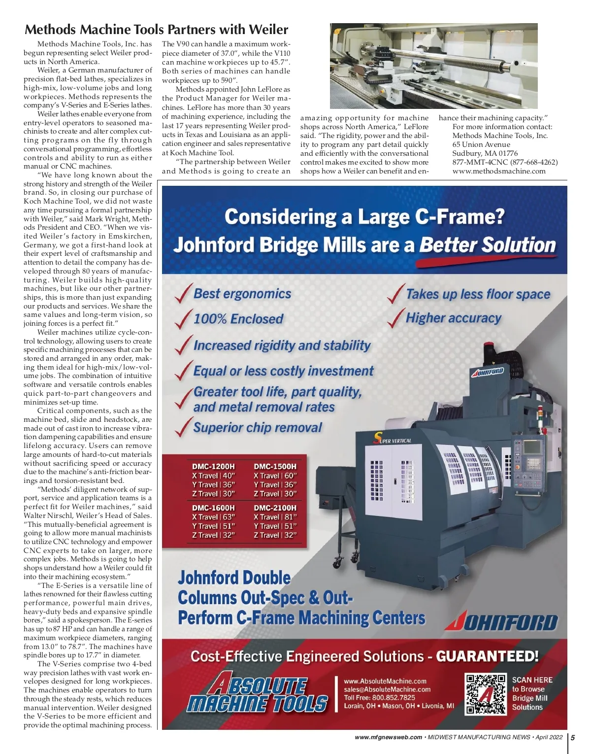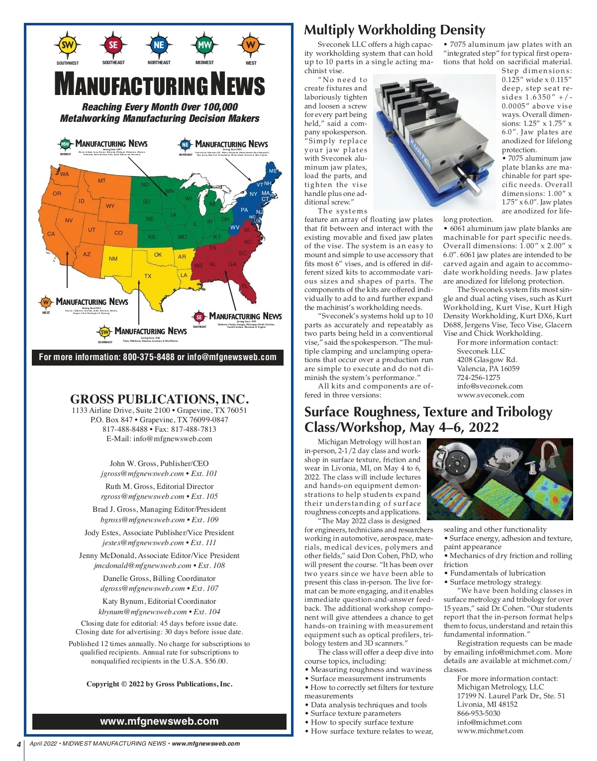 Multiply Workholding Density SW SOUTHWEST SE SOUTHEAST NE NORTHEAST MW MIDWEST W WEST M ANUFACTURING N EWS Reaching Every Month Over 100,000 Metalworking Manufacturing Decision Makers MW MI D W ES T M ANUFACTURING N EWS Serving Since 2007 Illinois, Indiana, Iowa, Kansas, Kentucky, Michigan, Minnesota, Missouri, Nebraska, North Dakota, Ohio, South Dakota and Wisconsin NE N O RTH E A S T M ANUFACTURING N EWS Serving Since 2005 Connecticut, Delaware, DC, Maine, Maryland, Massachusetts, New Hampshire, New Jersey, New York, Pennsylvania, Rhode Island, Vermont & West Virginia WA MT OR ID WY SD NE UT CO KS OK IA IL MO IN KY NC TN AZ NM TX AR MS LA FL AL GA SC ND MN WI MI PA OH MD DE ME VT NH NY MA RI CT NJ NV CA WV VA W W ES T M ANUFACTURING N EWS Serving Since 2012 Arizona, California, Colorado, Idaho, Montana, Nevada, Oregon, Utah, Washington & Wyoming SE SW SO UTHW ES T M ANUFACTURING N EWS Serving Since 1997 Alabama, Florida, Georgia, Mississippi, North Carolina, South Carolina, Tennessee & Virginia M ANUFACTURING N EWS Serving Since 1965 Texas, Oklahoma, Arkansas, Louisiana & New Mexico SO UTH E A S T For more information: 800-375-8488 or info@mfgnewsweb.com GROSS PUBLICATIONS, INC. 1133 Airline Drive, Suite 2100 • Grapevine, TX 76051 P.O. Box 847 • Grapevine, TX 76099-0847 817-488-8488 • Fax: 817-488-7813 E-Mail: info@mfgnewsweb.com John W. Gross, Publisher/CEO jgross@mfgnewsweb.com • Ext. 101 Ruth M. Gross, Editorial Director rgross@mfgnewsweb.com • Ext. 105 Brad J. Gross, Managing Editor/President bgross@mfgnewsweb.com • Ext. 109 Jody Estes, Associate Publisher/Vice President jestes@mfgnewsweb.com • Ext. 111 Jenny McDonald, Associate Editor/Vice President jmcdonald@mfgnewsweb.com • Ext. 108 Danelle Gross, Billing Coordinator dgross@mfgnewsweb.com • Ext. 107 Katy Bynum, Editorial Coordinator kbynum@mfgnewsweb.com • Ext. 104 Closing date for editorial: 45 days before issue date. Closing date for advertising: 30 days before issue date. Published 12 times annually. No charge for subscriptions to qualified recipients. Annual rate for subscriptions to nonqualified recipients in the U.S.A. $56.00. Copyright © 2022 by Gross Publications, Inc. Sveconek LLC offers a high capac-ity workholding system that can hold up to 10 parts in a single acting ma-chinist vise. “No need to create fixtures and laboriously tighten and loosen a screw for every part being held,” said a com-pany spokesperson. “Simply replace your jaw plates with Sveconek alu-minum jaw plates, load the parts, and tighten the vise handle plus one ad-ditional screw.” The systems feature an array of floating jaw plates that fit between and interact with the existing movable and fixed jaw plates of the vise. The system is an easy to mount and simple to use accessory that fits most 6” vises, and is offered in dif-ferent sized kits to accommodate vari-ous sizes and shapes of parts. The components of the kits are offered indi-vidually to add to and further expand the machinist’s workholding needs. “Sveconek’s systems hold up to 10 parts as accurately and repeatably as two parts being held in a conventional vise,” said the spokesperson. “The mul-tiple clamping and unclamping opera-tions that occur over a production run are simple to execute and do not di-minish the system’s performance.” All kits and components are of-fered in three versions: • 7075 aluminum jaw plates with an “integrated step” for typical first opera-tions that hold on sacrificial material. Step dimensions: 0.125” wide x 0.115” deep, step seat re-sides 1.6350” +/-0.0005” above vise ways. Overall dimen-sions: 1.25” x 1.75” x 6.0”. Jaw plates are anodized for lifelong protection. • 7075 aluminum jaw plate blanks are ma-chinable for part spe-cific needs. Overall dimensions: 1.00” x 1.75” x 6.0”. Jaw plates are anodized for life-long protection. • 6061 aluminum jaw plate blanks are machinable for part specific needs. Overall dimensions: 1.00” x 2.00” x 6.0”. 6061 jaw plates are intended to be carved again and again to accommo-date workholding needs. Jaw plates are anodized for lifelong protection. The Sveconek system fits most sin-gle and dual acting vises, such as Kurt Workholding, Kurt Vise, Kurt High Density Workholding, Kurt DX6, Kurt D688, Jergens Vise, Teco Vise, Glacern Vise and Chick Workholding. For more information contact: Sveconek LLC 4208 Glasgow Rd. Valencia, PA 16059 724-256-1275 info@sveconek.com www.sveconek.com Surface Roughness, Texture and Tribology Class/Workshop, May 4–6, 2022 Michigan Metrology will host an in-person, 2-1/2 day class and work-shop in surface texture, friction and wear in Livonia, MI, on May 4 to 6, 2022. The class will include lectures and hands-on equipment demon-strations to help students expand their understanding of surface roughness concepts and applications. “The May 2022 class is designed for engineers, technicians and researchers working in automotive, aerospace, mate-rials, medical devices, polymers and other fields,” said Don Cohen, PhD, who will present the course. “It has been over two years since we have been able to present this class in-person. The live for-mat can be more engaging, and it enables immediate question-and-answer feed-back. The additional workshop compo-nent will give attendees a chance to get hands-on training with measurement equipment such as optical profilers, tri-bology testers and 3D scanners.” The class will offer a deep dive into course topics, including: • Measuring roughness and waviness • Surface measurement instruments • How to correctly set filters for texture measurements • Data analysis techniques and tools • Surface texture parameters • How to specify surface texture • How surface texture relates to wear, www.mfgnewsweb.com 4 April 2022 • MIDWEST MANUFACTURING NEWS • www.mfgnewsweb.com sealing and other functionality • Surface energy, adhesion and texture, paint appearance • Mechanic