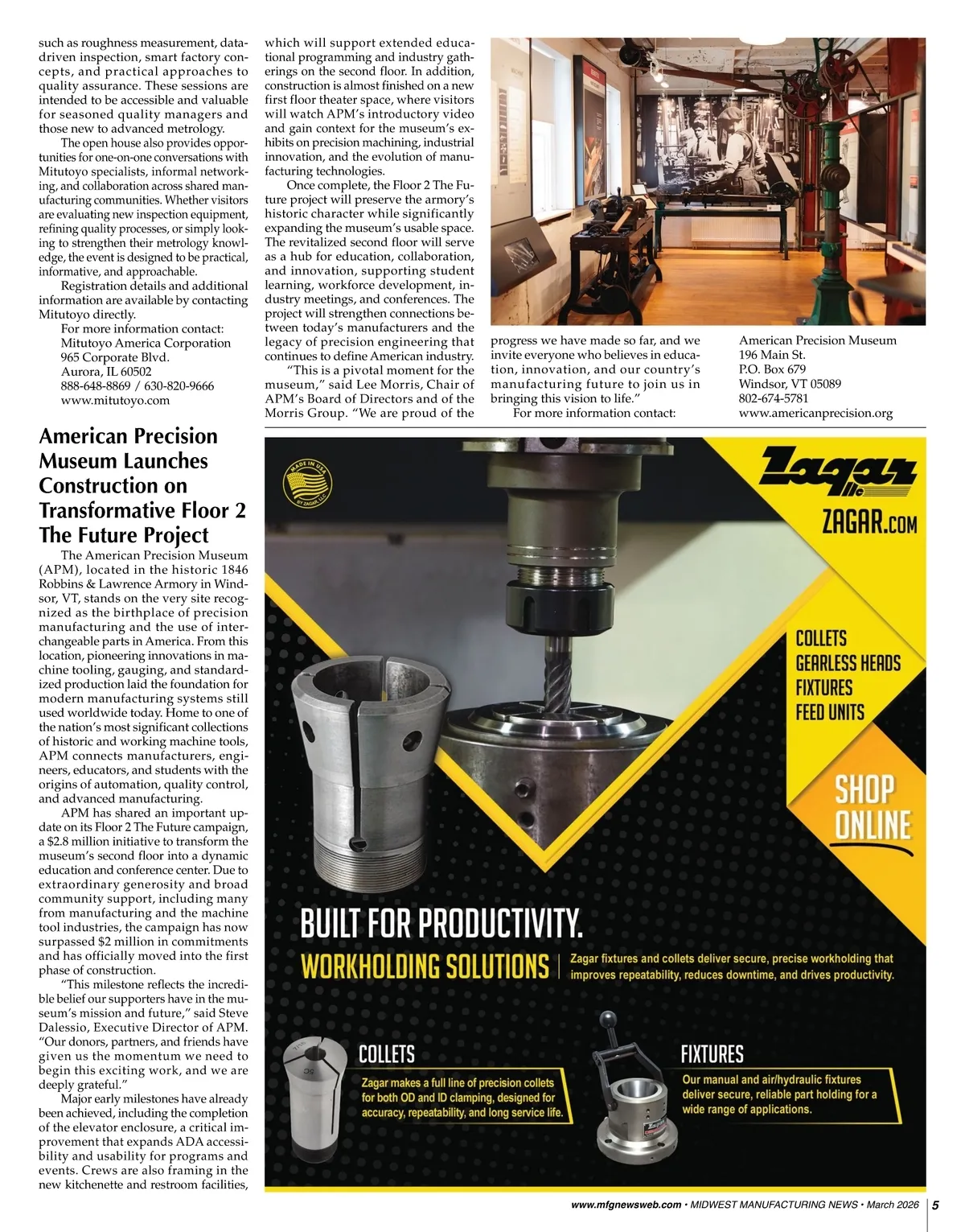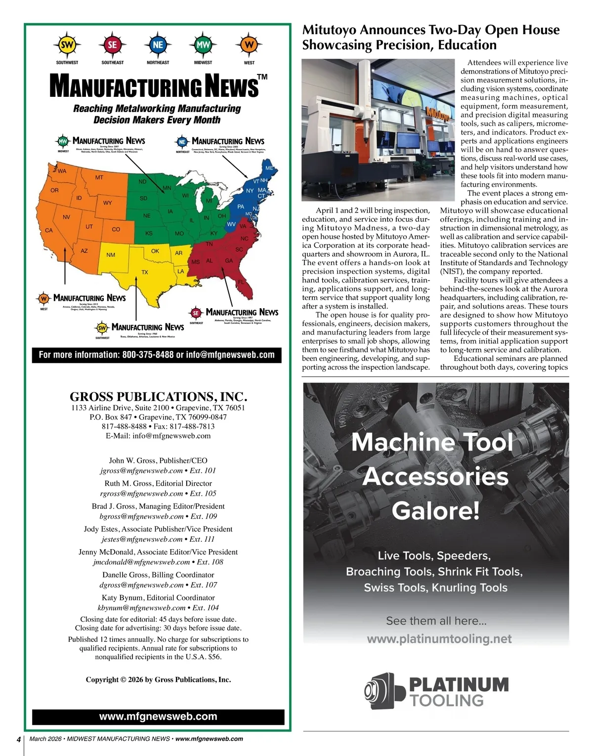 SW SOUTHWEST SE SOUTHEAST NE NORTHEAST MW MIDWEST W WEST Mitutoyo Announces Two-Day Open House Showcasing Precision, Education Attendees will experience live demonstrations of Mitutoyo preci-sion measurement solutions, in-cluding vision systems, coordinate measuring machines, optical equipment, form measurement, and precision digital measuring tools, such as calipers, microme-ters, and indicators. Product ex-perts and applications engineers will be on hand to answer ques-tions, discuss real-world use cases, and help visitors understand how these tools fit into modern manu-facturing environments. The event places a strong em-phasis on education and service. Mitutoyo will showcase educational offerings, including training and in-struction in dimensional metrology, as well as calibration and service capabil-ities. Mitutoyo calibration services are traceable second only to the National Institute of Standards and Technology (NIST), the company reported. Facility tours will give attendees a behind-the-scenes look at the Aurora headquarters, including calibration, re-pair, and solutions areas. These tours are designed to show how Mitutoyo supports customers throughout the full lifecycle of their measurement sys-tems, from initial application support to long-term service and calibration. Educational seminars are planned throughout both days, covering topics M ANUFACTURING N EWS ™ Reaching Metalworking Manufacturing Decision Makers Every Month NE NORTHEAST Serving Since 2007 Serving Since 2005 Illinois, Indiana, Iowa, Kansas, Kentucky, Michigan, Minnesota, Missouri, Nebraska, North Dakota, Ohio, South Dakota and Wisconsin MW MIDWEST M ANUFACTURING N EWS M ANUFACTURING N EWS Connecticut, Delaware, DC, Maine, Maryland, Massachusetts, New Hampshire, New Jersey, New York, Pennsylvania, Rhode Island, Vermont & West Virginia WA MT OR ID WY NV CA UT CO SD NE KS OK IA IL MO IN KY NC TN AZ NM TX AR MS LA FL AL GA SC ND MN WI MI PA OH MD DE ME VT NH NY MA RI CT NJ WV VA W WEST M ANUFACTURING N EWS Serving Since 2012 Arizona, California, Colorado, Idaho, Montana, Nevada, Oregon, Utah, Washington & Wyoming SE SW SOUTHWEST M ANUFACTURING N EWS Serving Since 1997 Alabama, Florida, Georgia, Mississippi, North Carolina, South Carolina, Tennessee & Virginia M ANUFACTURING N EWS Serving Since 1965 Texas, Oklahoma, Arkansas, Louisiana & New Mexico SOUTHEAST For more information: 800-375-8488 or info@mfgnewsweb.com April 1 and 2 will bring inspection, education, and service into focus dur-ing Mitutoyo Madness, a two-day open house hosted by Mitutoyo Amer-ica Corporation at its corporate head-quarters and showroom in Aurora, IL. The event offers a hands-on look at precision inspection systems, digital hand tools, calibration services, train-ing, applications support, and long-term service that support quality long after a system is installed. The open house is for quality pro-fessionals, engineers, decision makers, and manufacturing leaders from large enterprises to small job shops, allowing them to see firsthand what Mitutoyo has been engineering, developing, and sup-porting across the inspection landscape. GROSS PUBLICATIONS, INC. 1133 Airline Drive, Suite 2100 • Grapevine, TX 76051 P.O. Box 847 • Grapevine, TX 76099-0847 817-488-8488 • Fax: 817-488-7813 E-Mail: info@mfgnewsweb.com John W. Gross, Publisher/CEO jgross@mfgnewsweb.com • Ext. 101 Ruth M. Gross, Editorial Director rgross@mfgnewsweb.com • Ext. 105 Brad J. Gross, Managing Editor/President bgross@mfgnewsweb.com • Ext. 109 Jody Estes, Associate Publisher/Vice President jestes@mfgnewsweb.com • Ext. 111 Jenny McDonald, Associate Editor/Vice President jmcdonald@mfgnewsweb.com • Ext. 108 Danelle Gross, Billing Coordinator dgross@mfgnewsweb.com • Ext. 107 Katy Bynum, Editorial Coordinator kbynum@mfgnewsweb.com • Ext. 104 Closing date for editorial: 45 days before issue date. Closing date for advertising: 30 days before issue date. Published 12 times annually. No charge for subscriptions to qualified recipients. Annual rate for subscriptions to nonqualified recipients in the U.S.A. $56. Copyright © 2026 by Gross Publications, Inc. www.mfgnewsweb.com 4 March 2026 • MIDWEST MANUFACTURING NEWS • www.mfgnewsweb.com